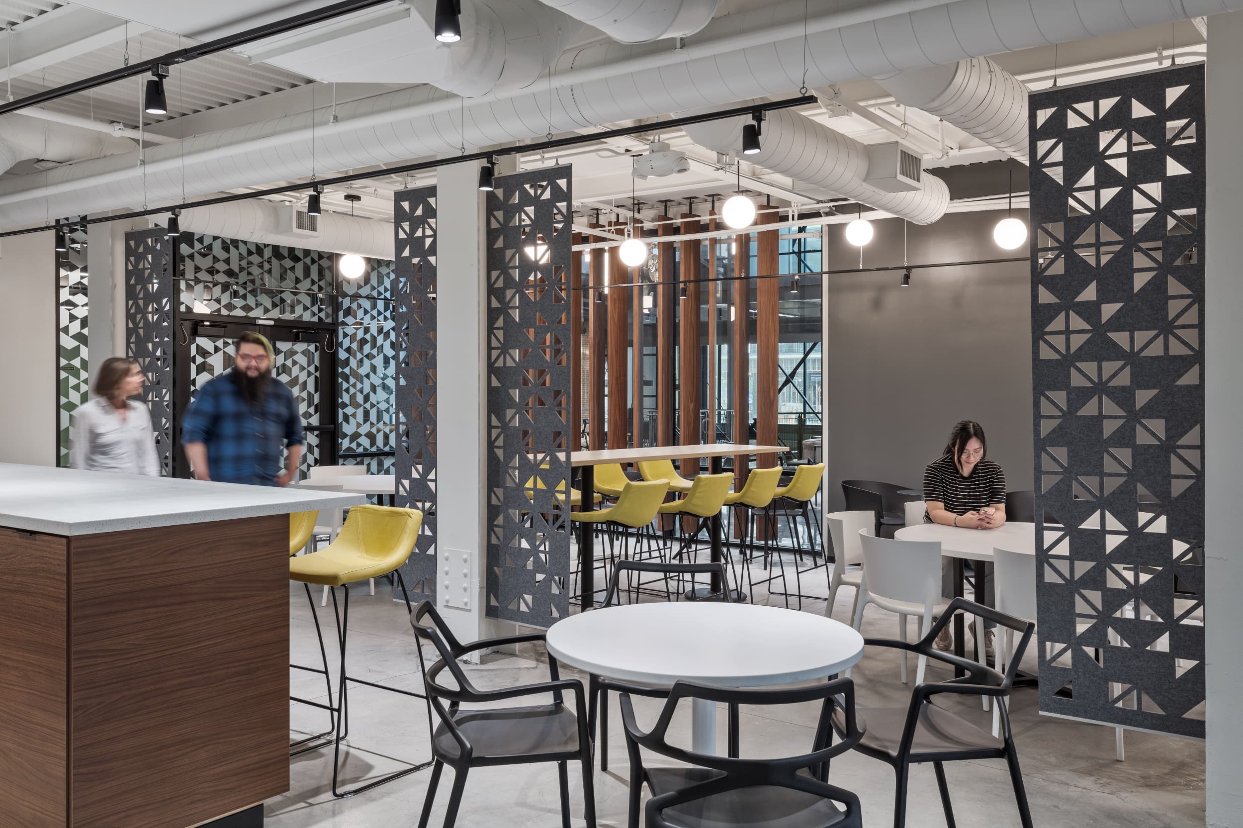 The cantina carries over the industrial feel with the patterned acoustic panels and exposed ceilings.