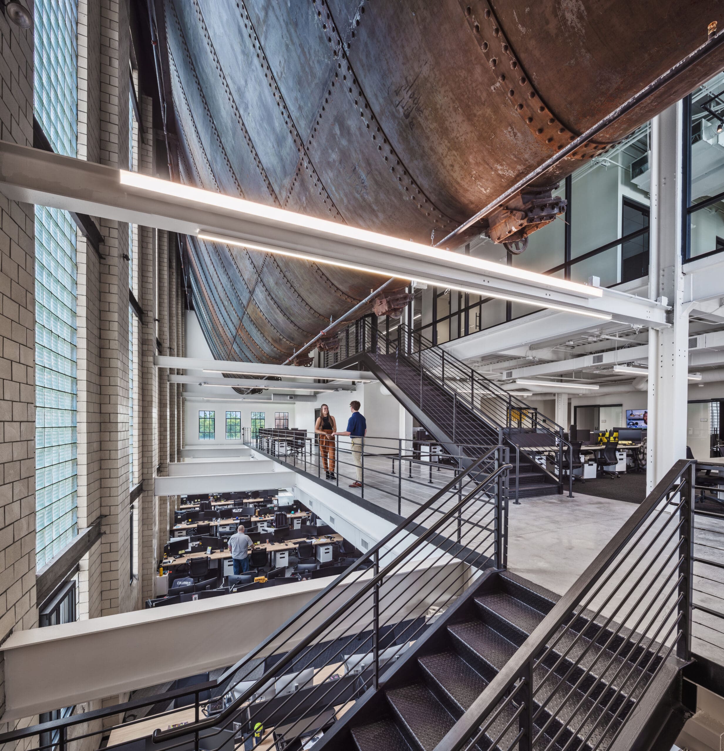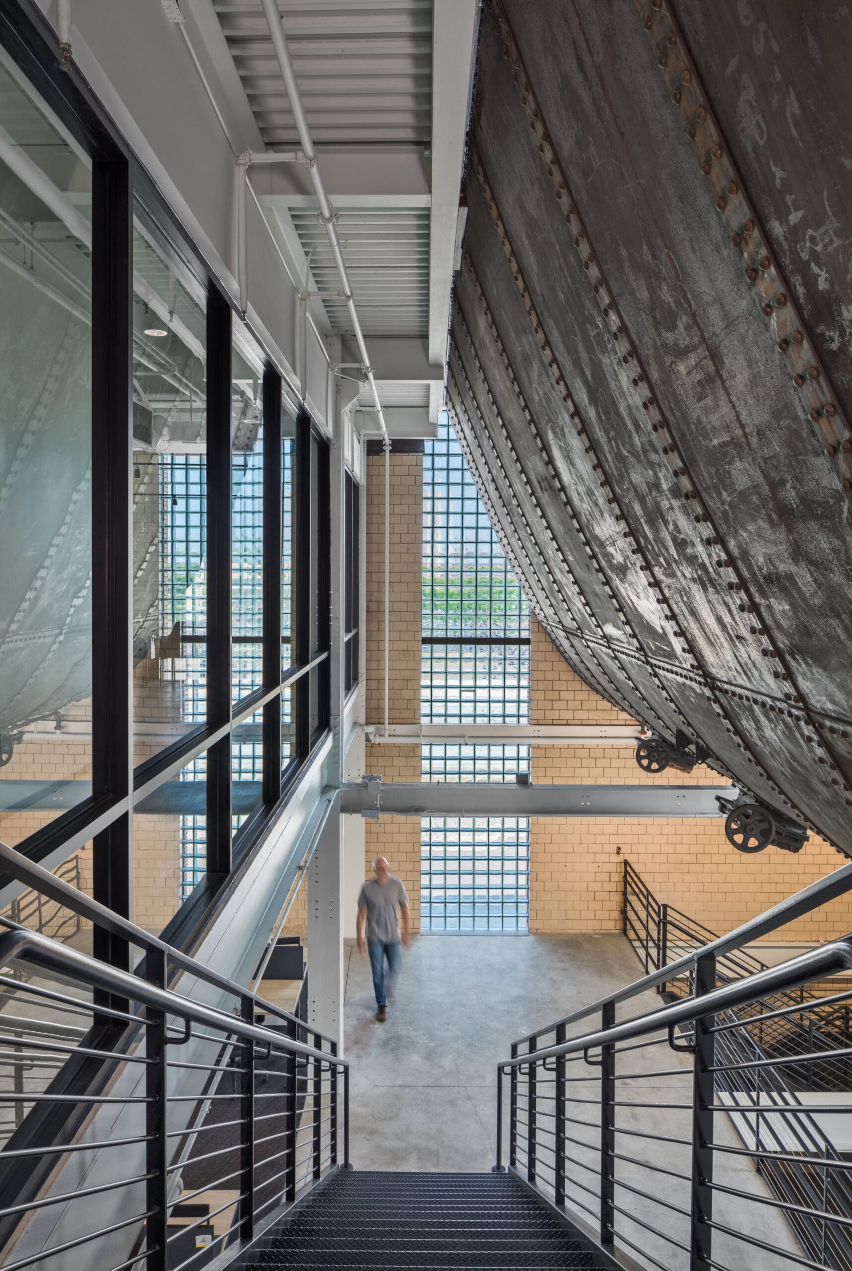 The Studio carefully planned the office in a way that paid homage to the building’s rich history while seamlessly adding contemporary elements. Upon entering the lobby, one is greeted with an old vault door, exposed trusses that intermingle antique cranes from their industrial use and modern pendant lighting. From the antique yellow tinted tiles, old glass block windows, to an old coiling door in the conference room, there are subtle nods of its past throughout the building. One of the more unique features of the structure is the massive coal shoot that spans across the open office. Tying in the grit and the industrial nature of the space, The Studio made it a focal point rather than remove it.
